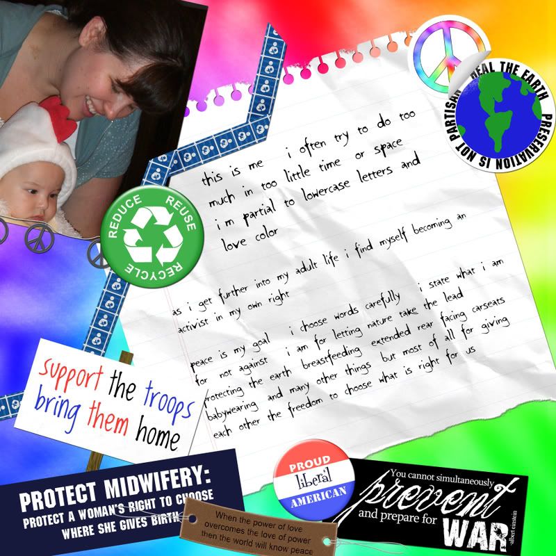 My friend Jen told me about this design challenge at a digiscrapping forum called Brownie Scraps. On my very first visit there I signed up... My goal: improve my photoshop skills. Result: a new addiction.